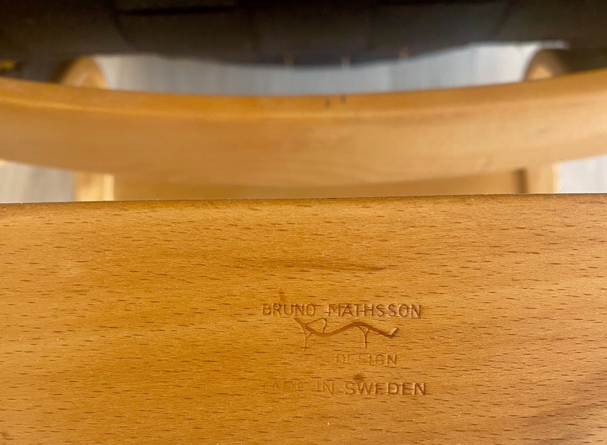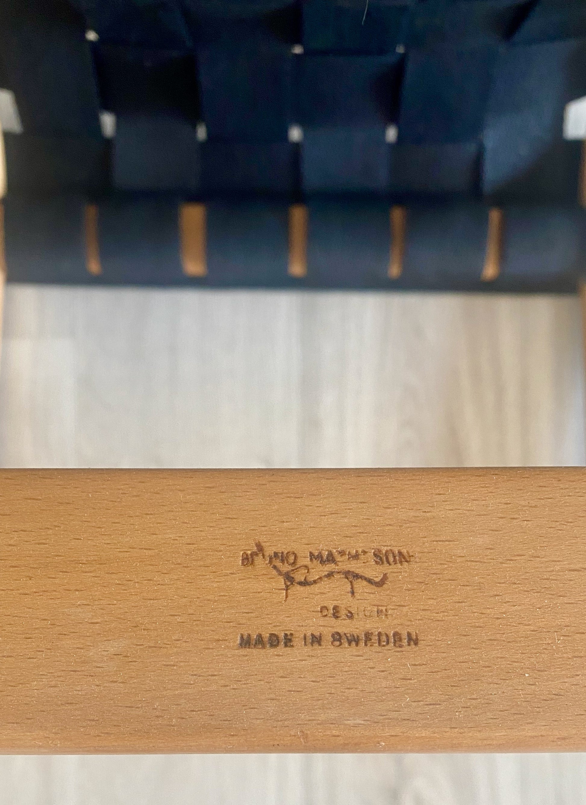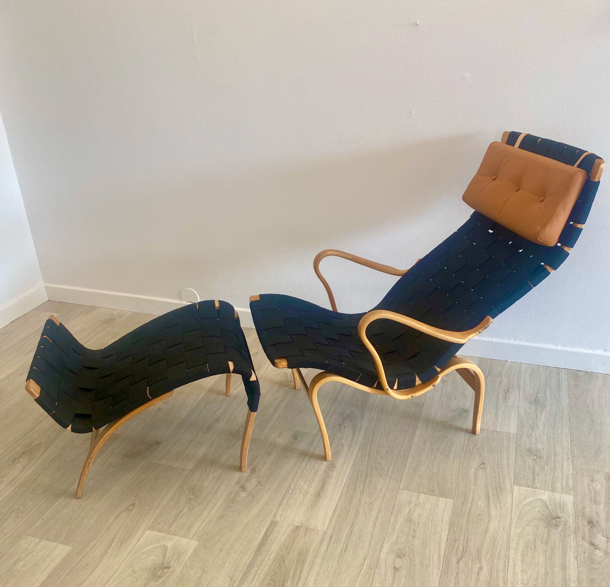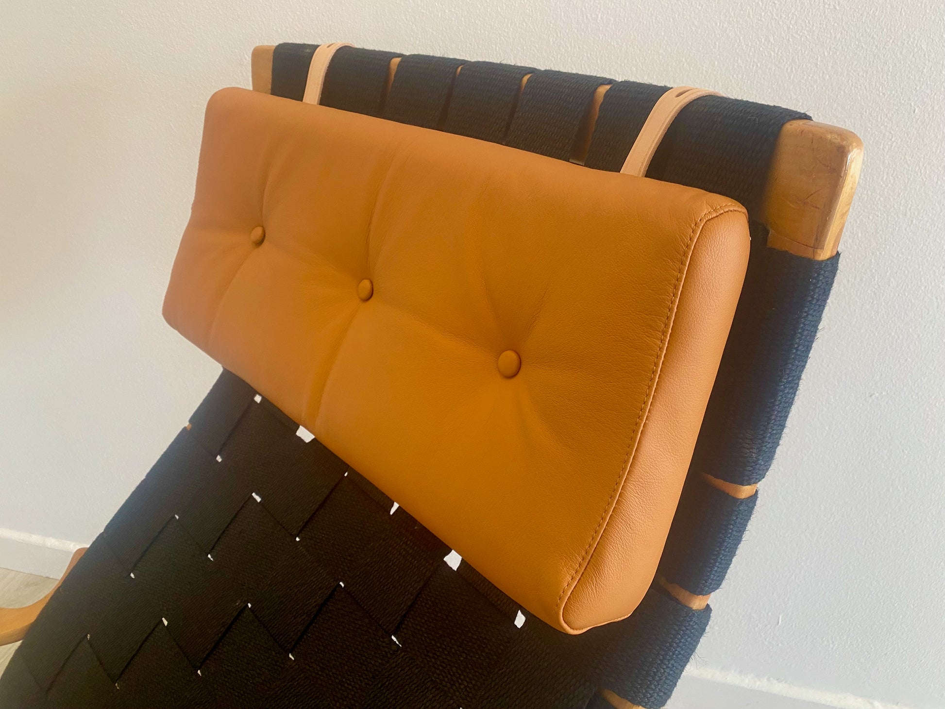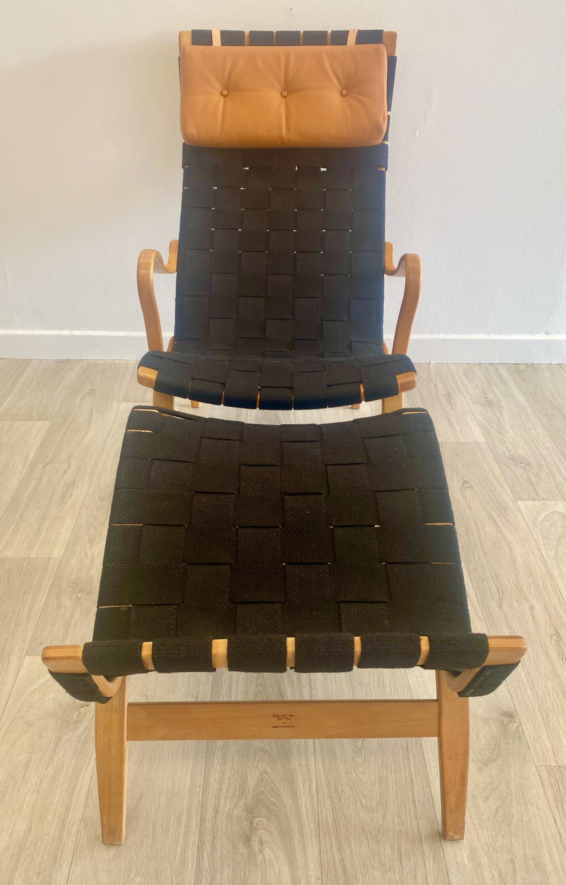 Bruno Mathssons vilstol - Pernilla 1 - med fotpall. Ny svart sadelgjord och nackkudde. Höjd: 91 cm, bredd: 62 cm, längd: 99 cm. Fotpall: 42, 50, 65 cm.