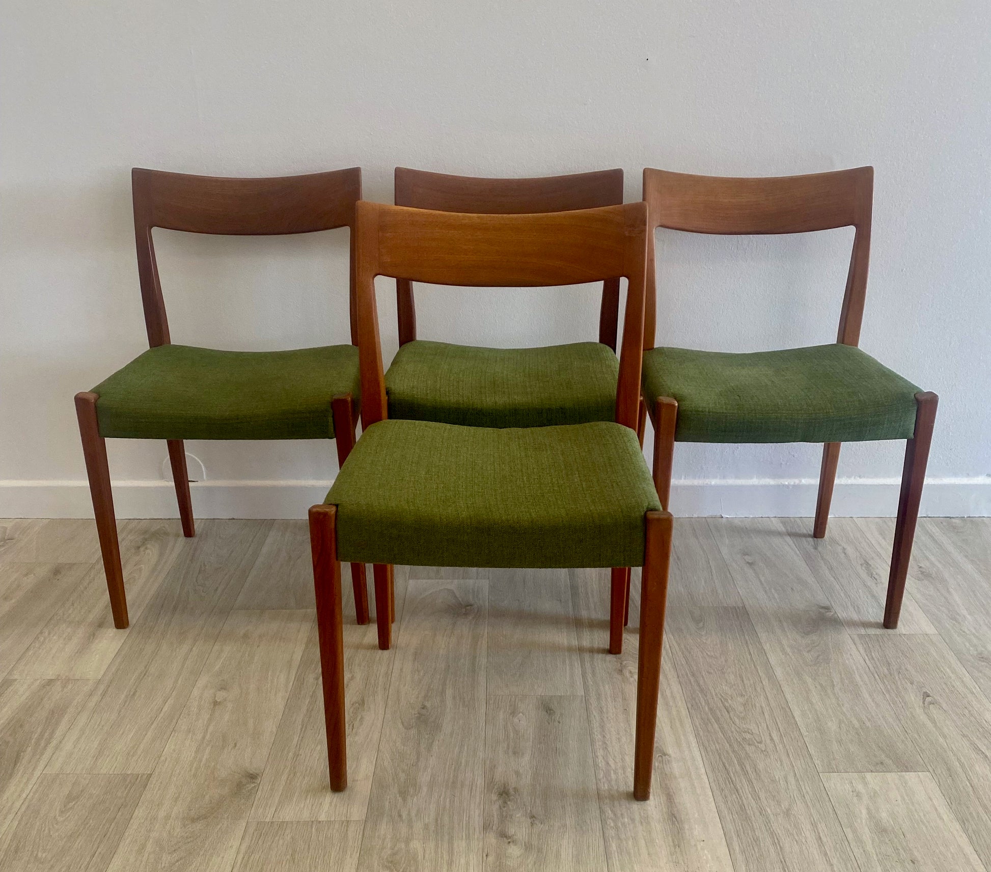 Set of 4 teak chairs, model Kontiki, designed in the 1950´s by Yngve Ekström for Troeds. Newly upholstered.